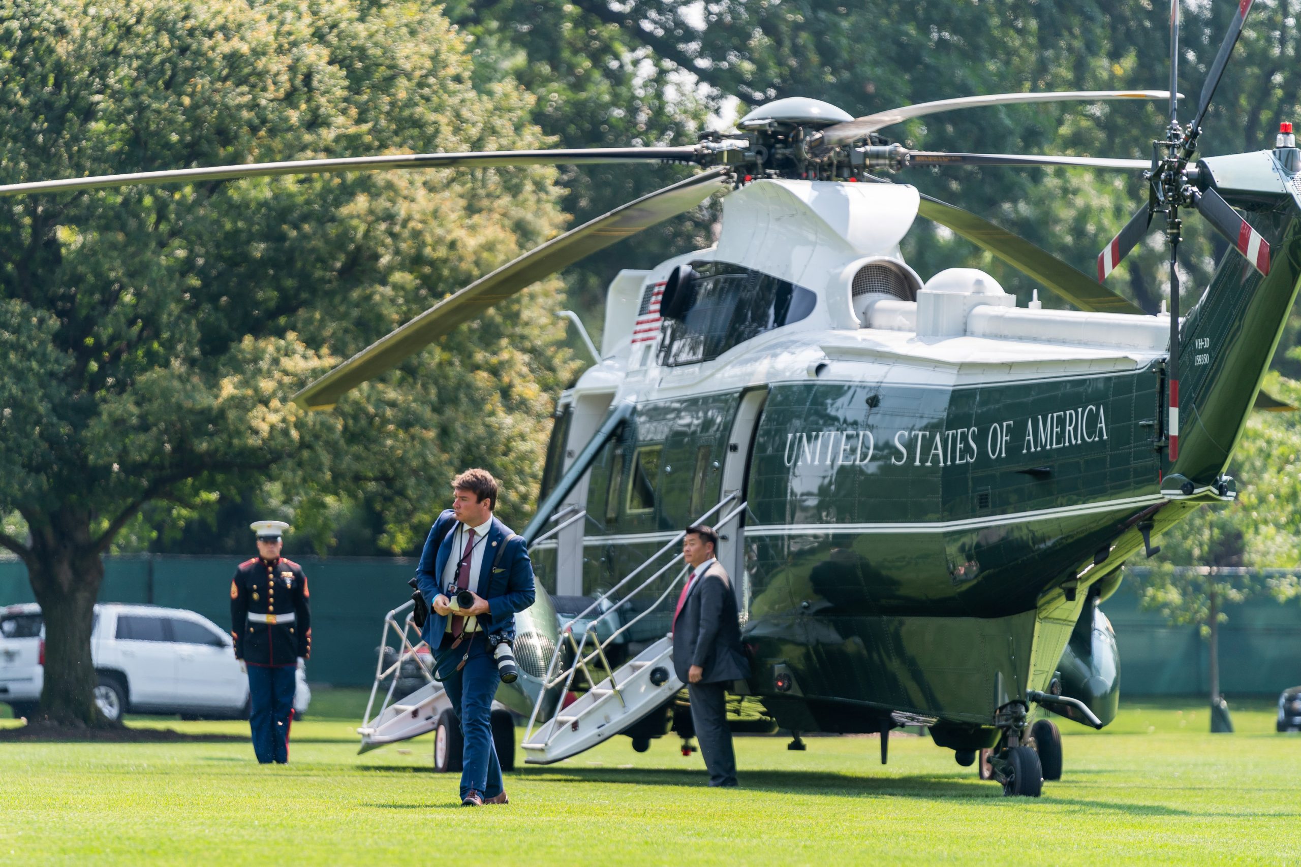 Above: Chief Official White House Photographer Adam Schultz disembarks Marine One on the South Lawn of the White House Tuesday, August 10, 2021, after a weekend trip to Delaware with the Bidens. (Official White House Photo by Cameron Smith)